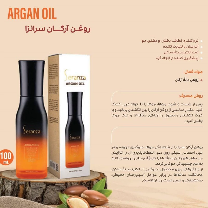 روغن آرگان سرانزا از شکنندگی موها جلوگیری نموده و در عین احساس سبکی روی مو ¸ انعطاف پذیری آن را افزایش می دهد. همچنین ساقه ها را کاملا آب رسانی نموده و باعث به هم چسبیدگی مو نمی گردد.